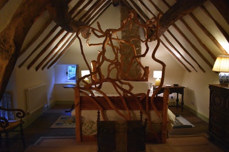 This large eco-friendly treehouse is a magical place to stay. Located alongside a Medieval fish pool, it has a private outdoor hot tub and fire pit. Luxurious interior with quality, bespoke, handcrafted furniture, comfortable bedroom and underfloor heating throughout. Constructed using reclaimed, recycled and sustainable materials. Guests receive a welcome pack of locally-produced food.