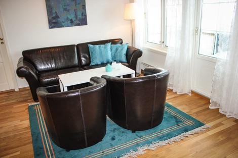 Our two-storey, two-bedroom apartment at Gjestegaarden was spacious, clean and pleasantly furnished. There was an open space living and dining room with well-equipped kitchen area, large balcony and comfortable sofas to relax in.